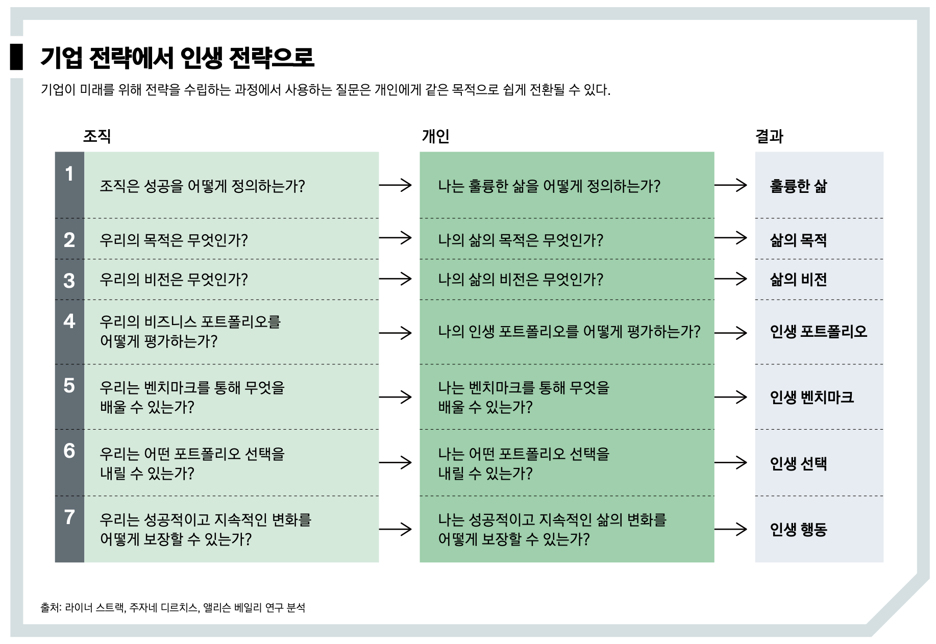 얼마전 하버드 비지니스 리뷰에는 개인의 가슴 뛰는 삶을 위한 전략적 사고를 세울 도구를 소개했다. 저자인 라이너 스트랙(Rainer Strack)은 BCG의 수석 파트너이자 수석 자문가로 10년 동안 글로벌 인재 전략 토픽을 구축하고 이끌었다. 2014년 TED 강연을 했으며 그에 앞서 세계경제포럼 ‘일의 미래’ 이니셔티브를 공동 진행했다. 2021년에는 퍼스널매거진(Personalmagazin)의 HR명예의 전당에 이름을 올렸다. BCG 헨더슨 인스티튜트의 펠로다. 주자네 디르치스(Susanne Dyrchs)는 경영 자문가 겸 코치이자 인력 전략 전문가다. BCG U 교수진으로 조직과 리더십, 인재에 관한 수많은 출판물을 공동 저술했다. 2021 년에는 자신의 변화 여정에 대해 쓴 <Wir-Zeit>를 출판했다. 앨리슨 베일리(Allison Bailey)는 BCG의 수석 파트너이자 전무이사다. 글로벌 인력 및 조직 관행을 이끌고 있으며 일의미래, 생체 공학회사, 디지털학습, 기술 향상에 대한여러 출판물을 공동 저술했다. BCG 헨더슨 인스티튜트의 펠로다.