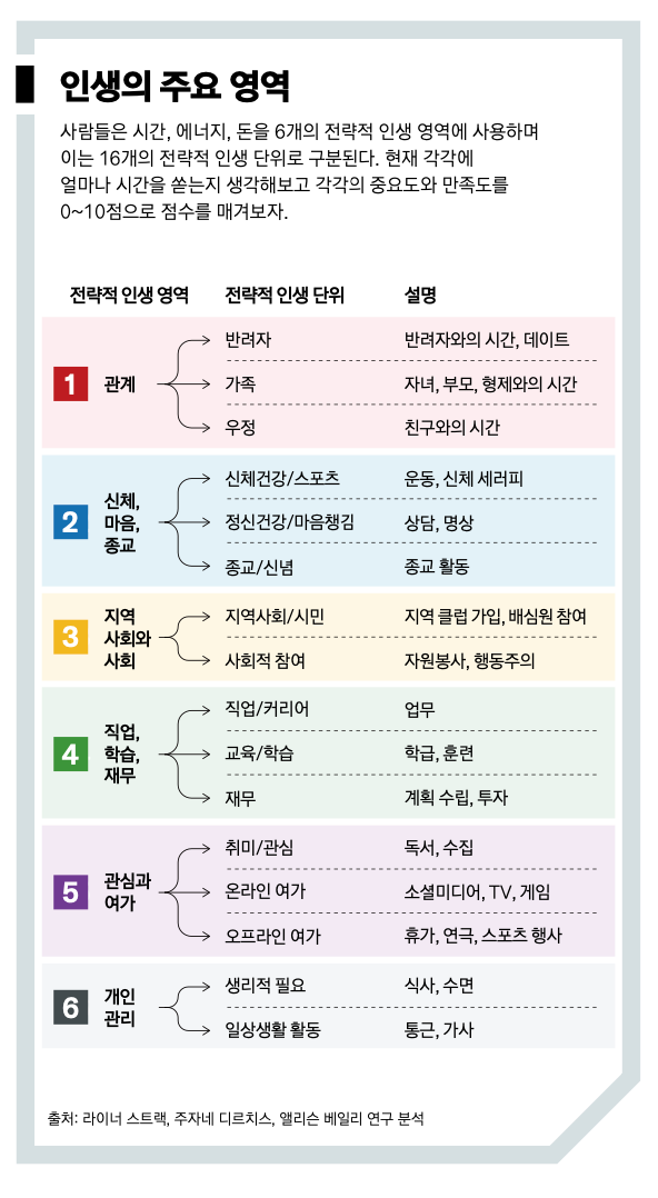 휴일을 포함한 지난 1년을 되돌아보고 평균 주당 16개 SLU 각각에 시간을 얼마나 소비했는지 측정해보자. 하나의 활동이 여러 카테고리에 포함된다면 해당되는 카테고리 간에 시간을 분배하라. 일주일에 한 시간 동안 반려자와 조깅을 했다면 30분은 반려자 SLU에 할당하고, 30분은 신체건강/스포츠 SLU에 할당하라. 다음으로 당신에게 얼마 나 중요한지에 따라 16개 SLU를 0~10점으로 모두 평가하라. 그런 다음 각 항목에서 얻은 만족도를 동일한 척도로 평가하라.