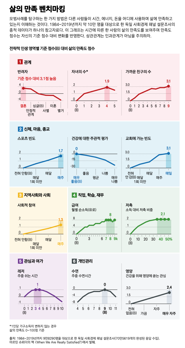 삶의 만족도에 관한 세계 최대 규모의 연구는 독일 사회경제 패널의 설문조사다. 이 설문조사는 1984~2019년까지 거의 10만 명을 대상으로 70만 개 이상의 완성된 응답을 수집했다. 반려자, 자녀, 친구, 스포츠, 종교, 지역사회 참여, 급여, 저축, 영양이 모두 삶의 만족에 기여한다는 사실이 밝혀졌다. 당연하게도건강 문제는 삶의 만족에 매우 부정적인 영향을 미치며 여가와 수면 시간의 경우 최적 수준이 존재한다.
