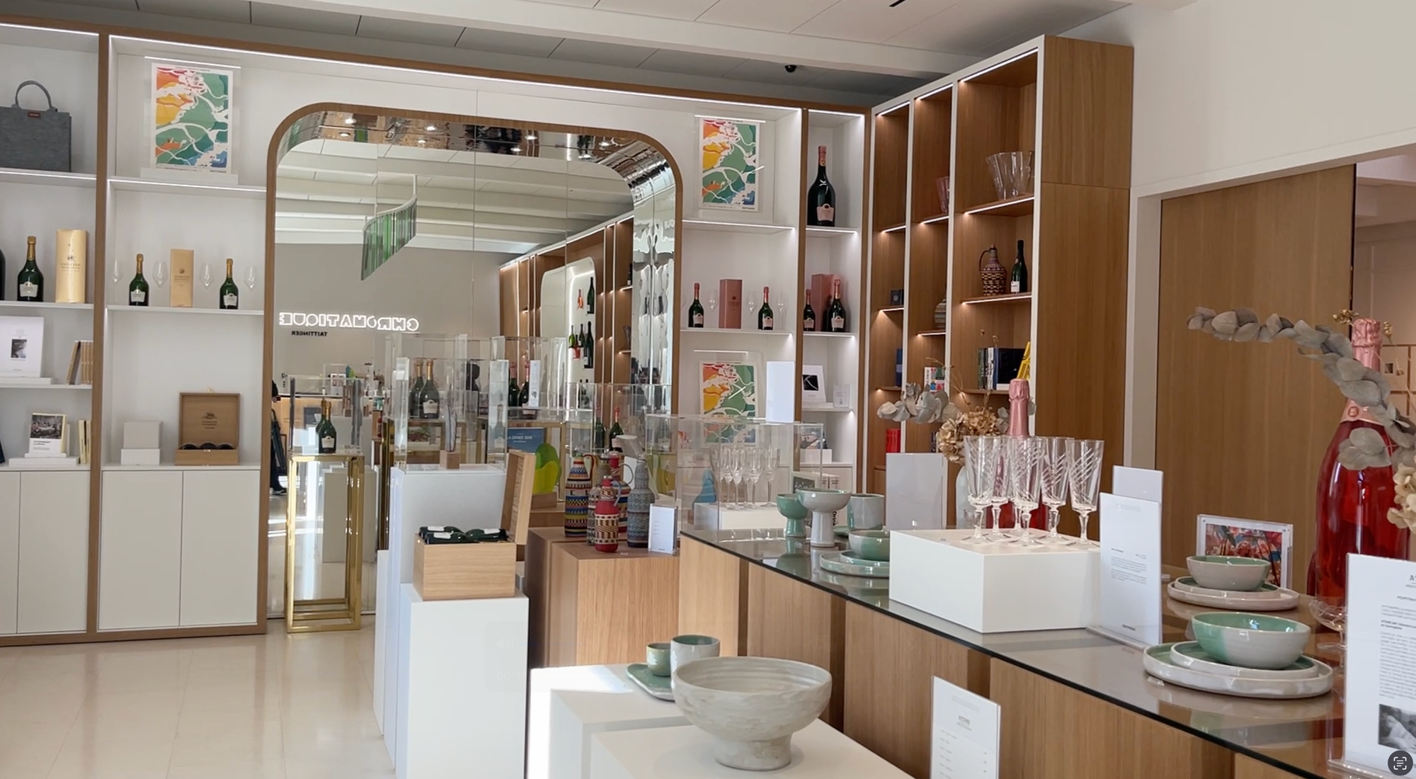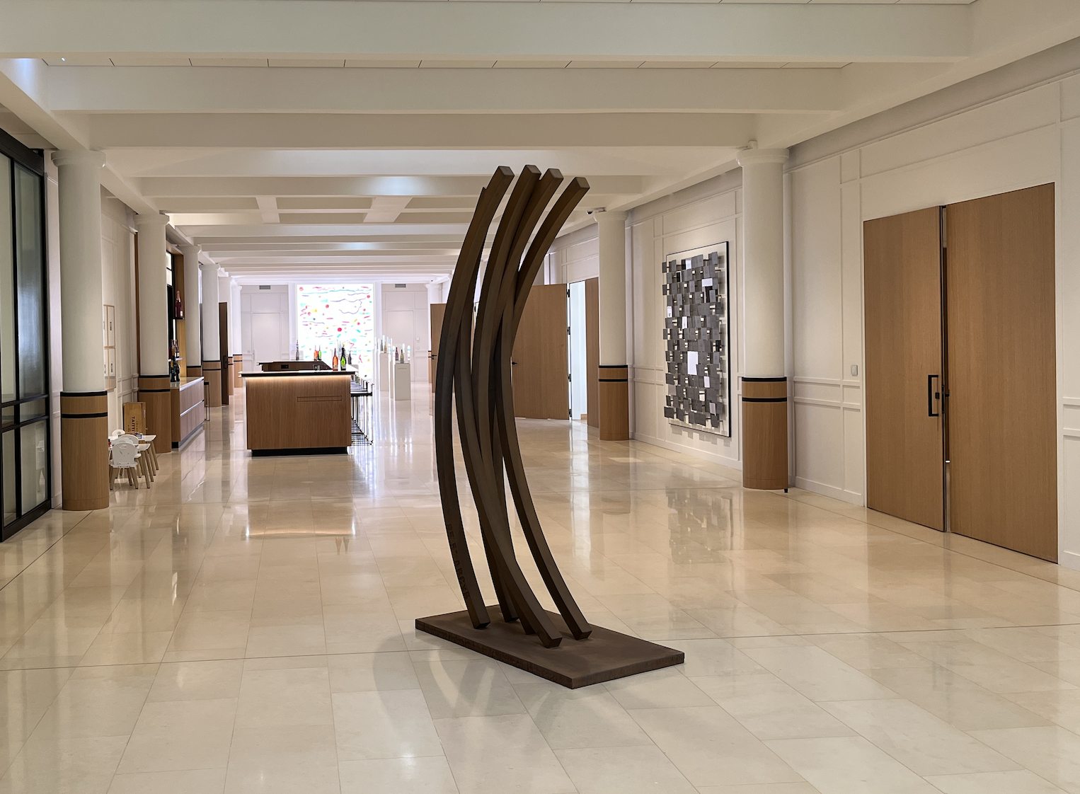 Visitor Center Filled with the Fragrance of Art Taittinger's visitor center is not merely an information desk but a space of artistic sensibility. In the lobby of the visitor center, works by contemporary sculptor Bernar Venet are exhibited. An elegantly curved brown iron sculpture adds dynamism to the space. This piece is also planned to be placed in the outdoor garden that will be created. Venet's minimal linear work expresses Taittinger's philosophy of elegance and simplicity. Reminiscent of the flow of bubbles in champagne and the graceful ridges of vineyards, this artwork permeates the space with the fragrance of art. Visitors who complete their tasting surrounded by Taittinger's art project series will finally cheer at the Chromatique store, which is stocked with products full of artistic sensibility.